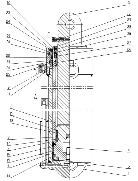 2、原理如圖所示:升柱時,由接口A進液,中缸兼活柱首先伸出并到位,液力推開中缸下部底閥,使活柱伸出。降柱時,由接口B進液,中缸及活柱首先降縮至缸底限位處,頂桿將底閥頂開,接口C進液,使活柱下降。